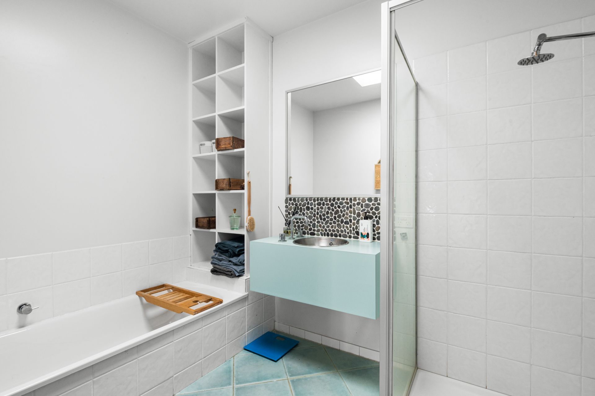 The centrally located bathroom features both a shower and a full-size bath, ideal for relaxation or family needs, with a separate toilet for added convenience.