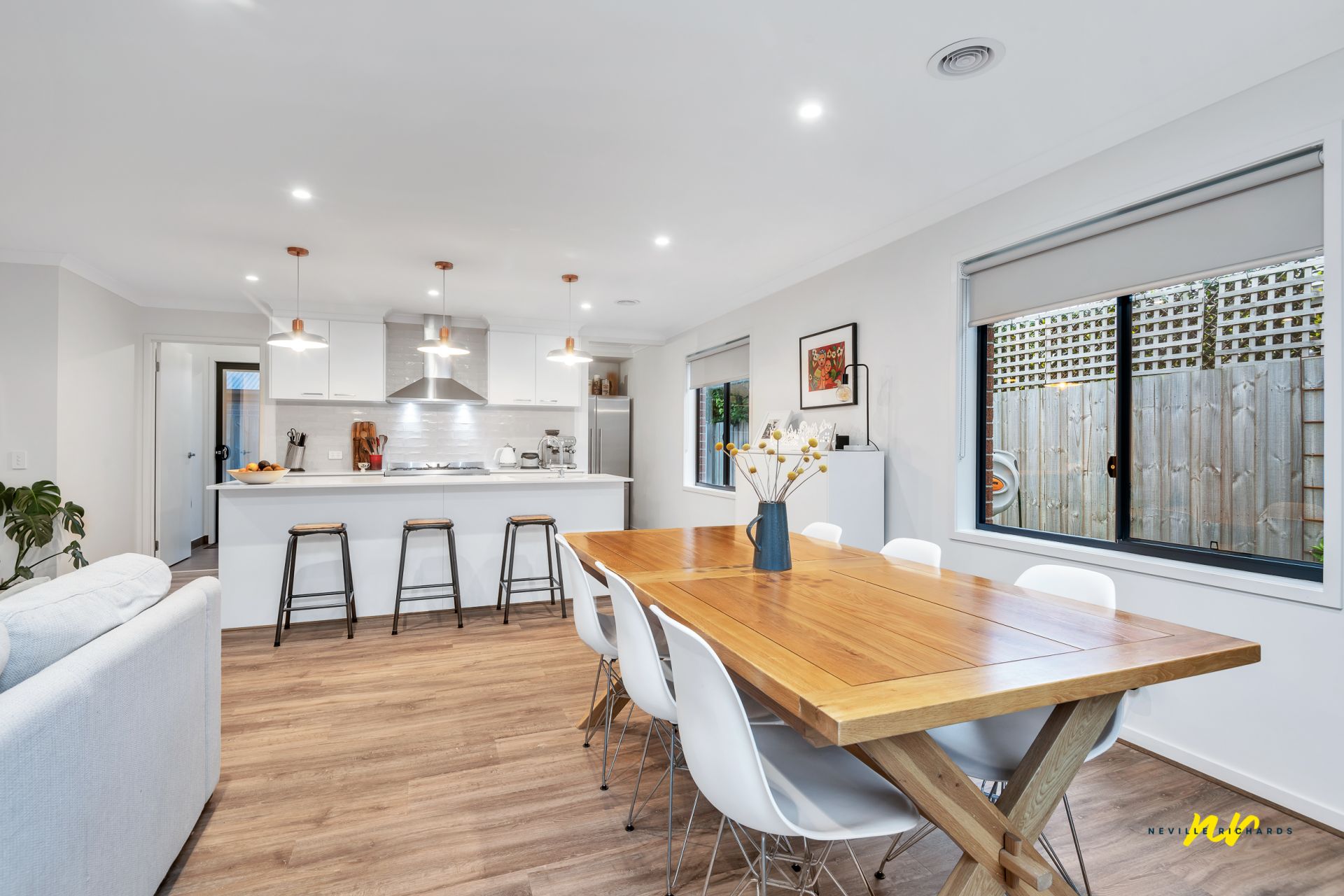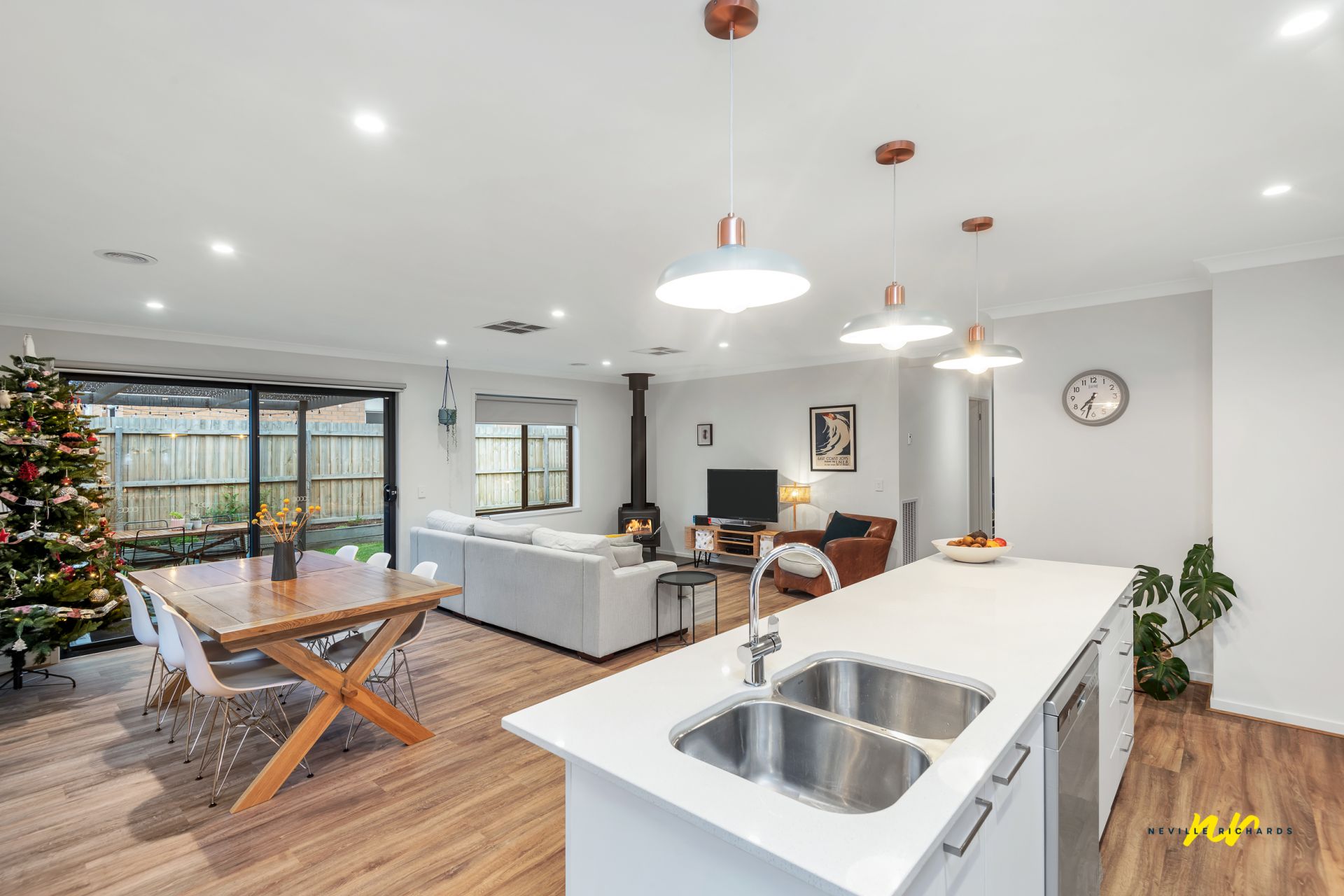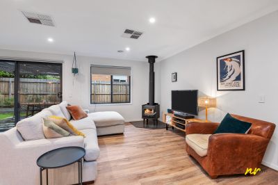 • The primary living zone consists of an open plan kitchen/family/dining zone, it is bathed in an abundance of natural light; wonderful use of expansive windows creates a lovely inside/outside connection to native landscaped gardens (complimented by a classic green leafy Drysdale setting). A wood log heater creates ambience and a warm 'welcome home' feel.