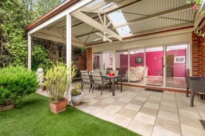 Sliding doors open to a covered outdoor entertaining area - complete with ceiling fan - overlooking a tranquil rear yard with mature plantings that create privacy and a soothing garden outlook.