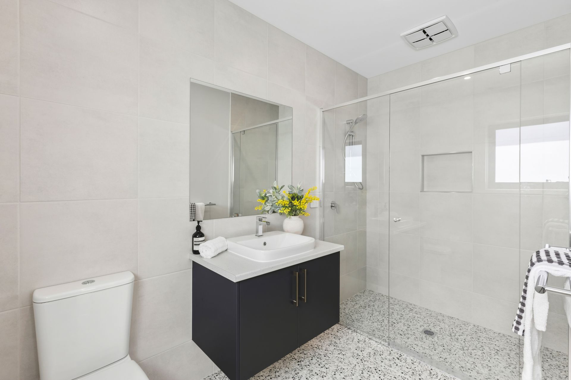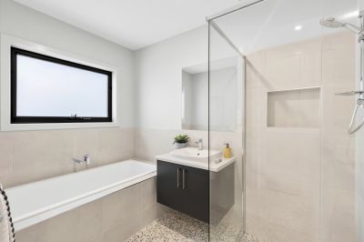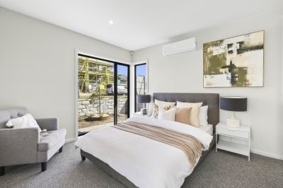 The residence delivers a 7-star energy efficiency rating and is fully electric, supported by a 5.58kW solar PV system with provisions for both battery storage and an EV charger. Everyday living is enhanced with luxury finishes such as Caesarstone benches, upgraded fixtures and fittings and soaring 2550mm square-set ceilings. The kitchen is appointed with 900mm Westinghouse appliances, while LED feature lighting and quality floor coverings add to the refined atmosphere. Comfort is assured with an 11.4kW multi-head air conditioning system and an additional 8.2kW unit in the family room.