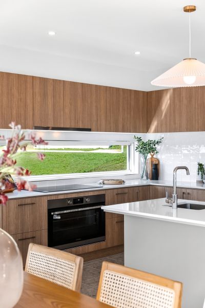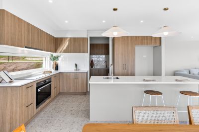 Set on a 420m² (approx.) allotment, the home is designed to impress with high-end appointments throughout. From the moment you arrive, the home's contemporary aesthetic and elevated position set the tone for the refined lifestyle within. Inside, spacious open-plan living zones are enhanced by 2550mm ceiling heights and square-set cornices, while the Caesarstone benchtops and upgraded fixtures add a sense of everyday indulgence. The chef's kitchen features 900mm Westinghouse appliances and sleek finishes, forming a stylish centrepiece for entertaining or family living.