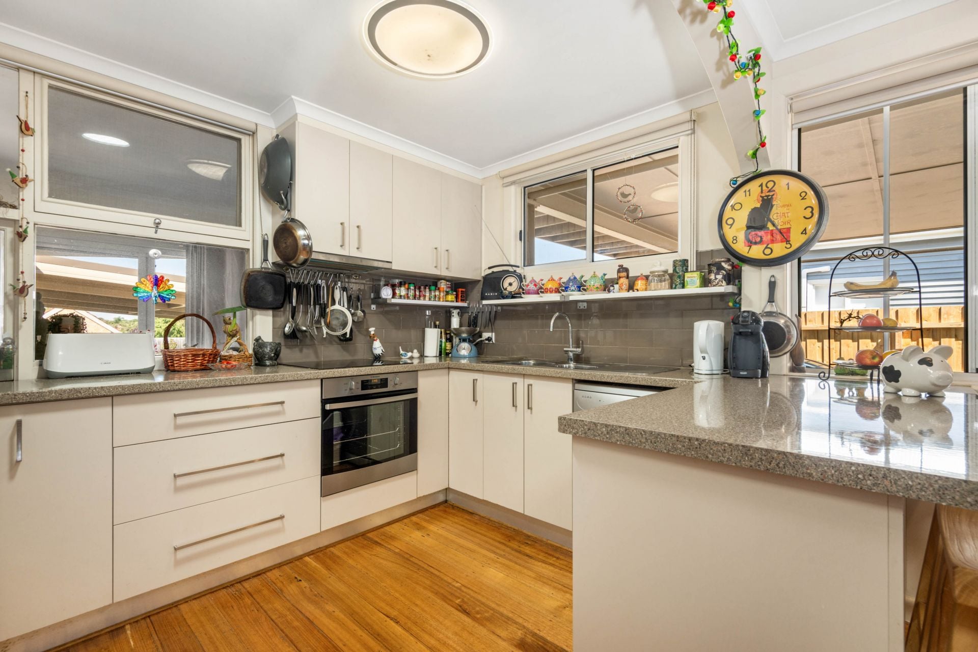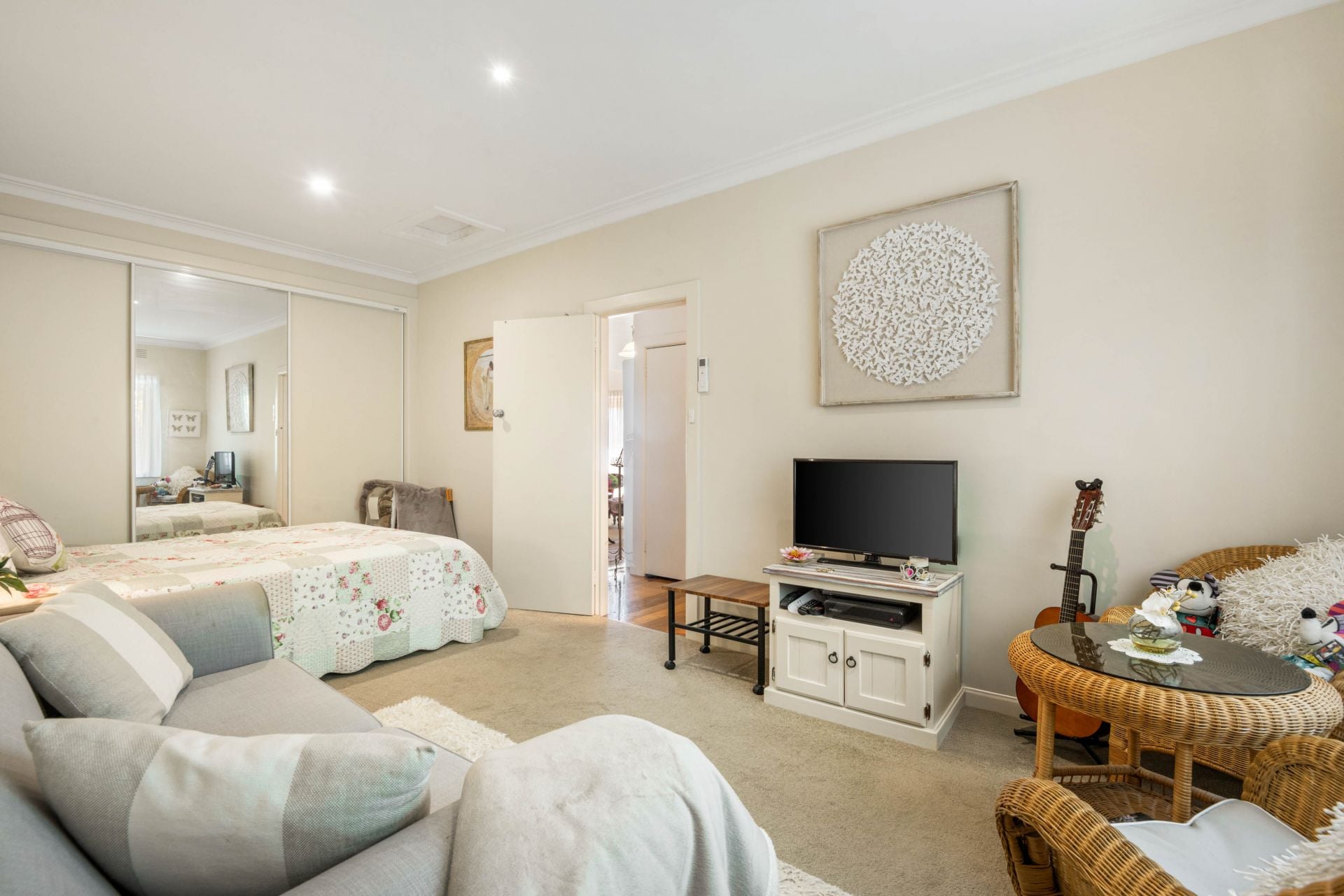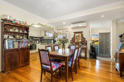 The rear wing functions as a fully self-contained two-bedroom residence, also with timber floors and a modern open-plan kitchen and living zone. Both bedrooms feature built-in robes and share a stylish bathroom, making this wing ideal for extended family or short-stay accommodation.