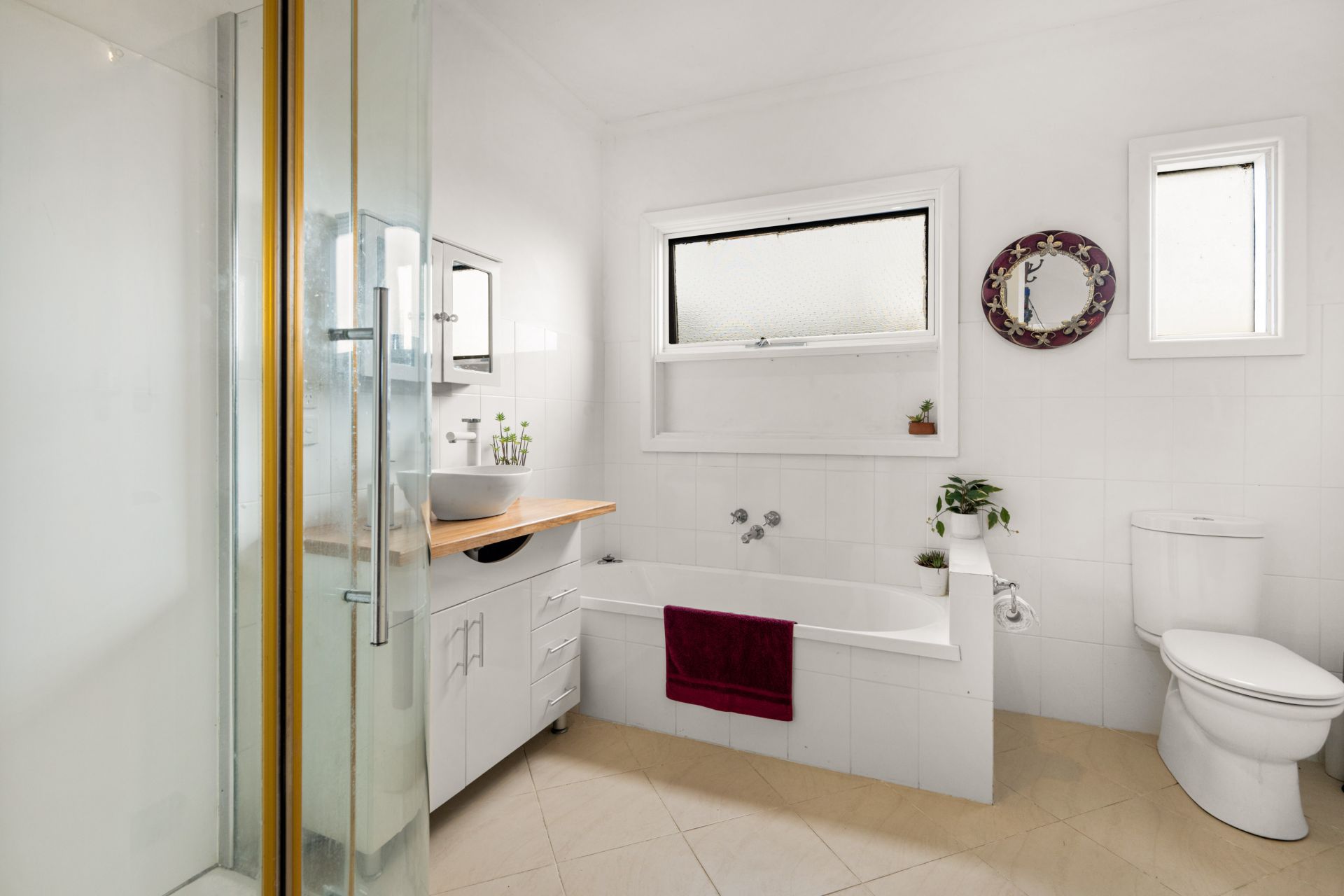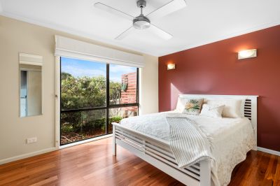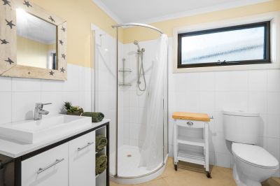 Accommodation comprises three bedrooms, two of which are located upstairs, each with built-in robes. One bedroom enjoys spectacular views and private access to the undercover entertaining area. Bathrooms on both levels ensure comfort and convenience for family and guests alike, while reverse-cycle air-conditioning throughout the home guarantees year-round climate control.