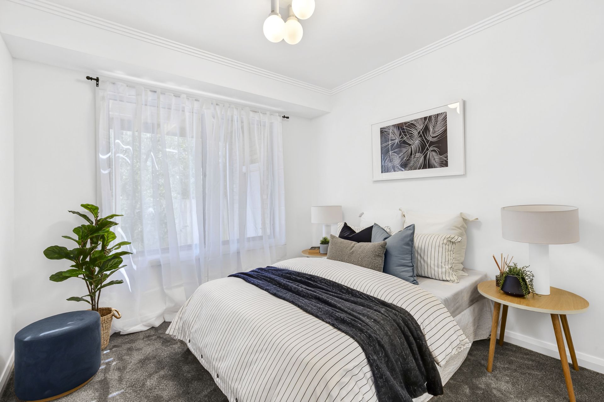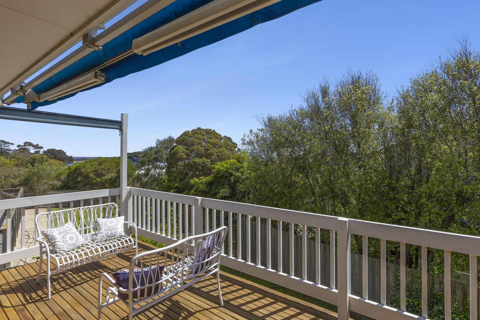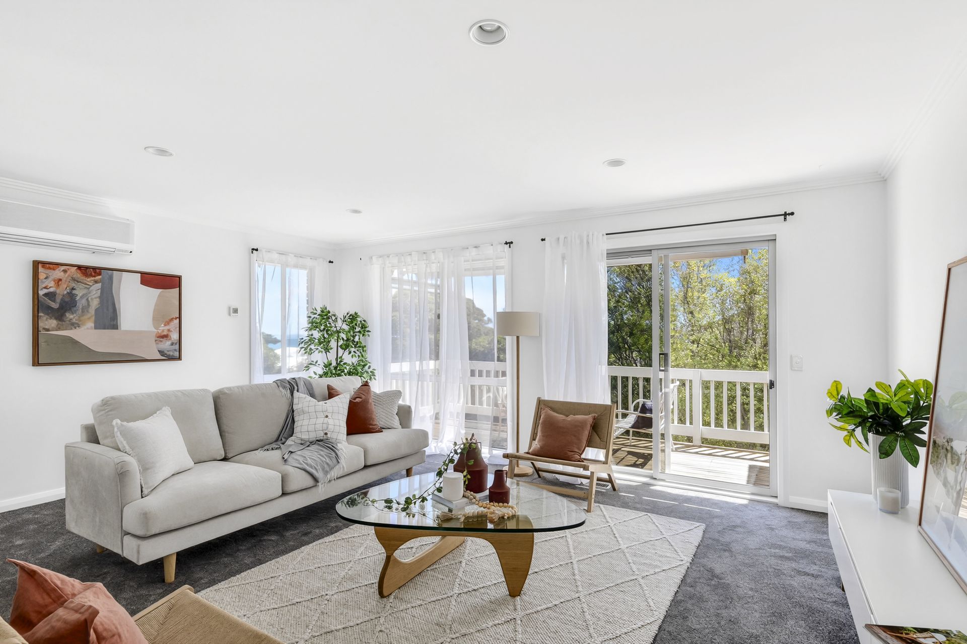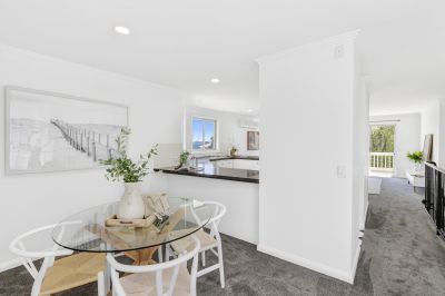 The light-filled open-plan kitchen, living and dining area exudes a bright, coastal aesthetic - a relaxed space perfect for entertaining or unwinding. Sliding doors open to a sunlit balcony that captures beautiful views across Portarlington Beach and the bay, creating the perfect backdrop for morning coffees or evening sunsets.