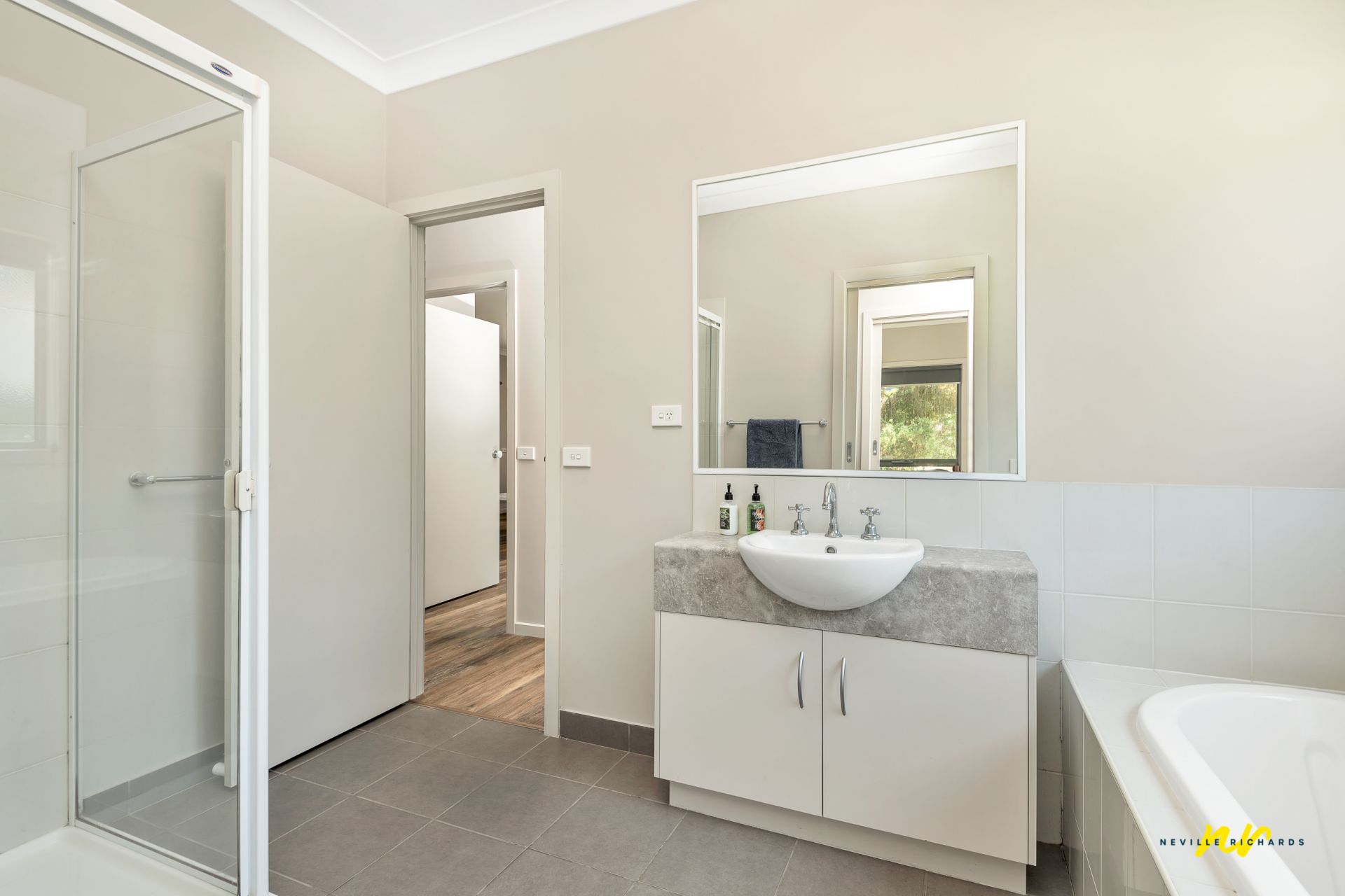 The three bedrooms are generous in size and the master features walk in robe. A central bathroom doubles as a semi-en-suite.