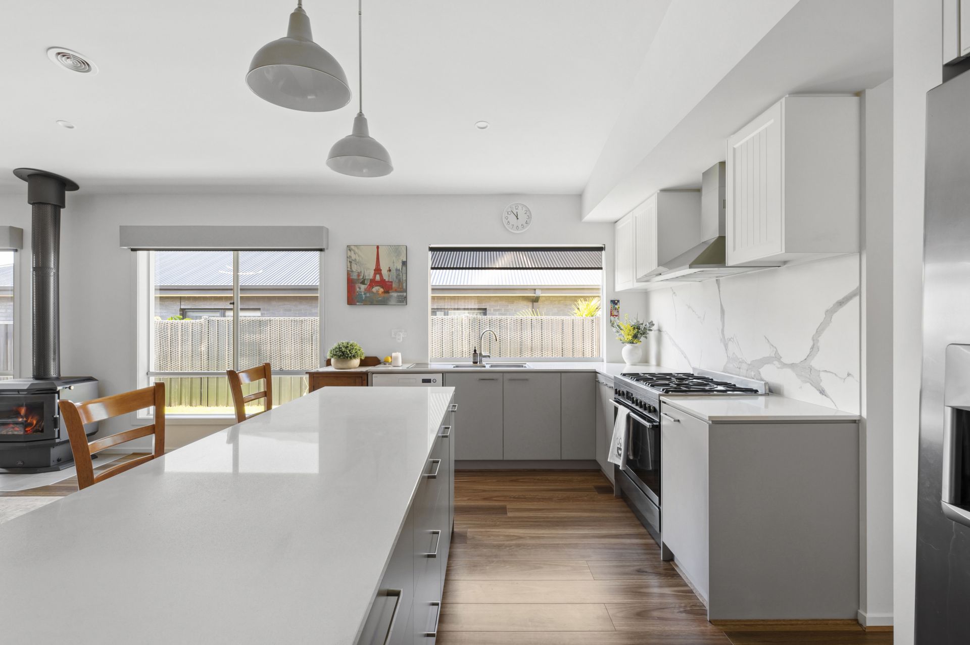 Designed for easy living, the home boasts a spacious, open-plan living, dining, and kitchen area that maximises natural light, featuring raked ceilings and a cosy wood-fired heater. The chef's kitchen is a standout, with sleek stone benchtops, premium appliances, and quality cabinetry, complemented by a practical butler's pantry and separate laundry. A second, carpeted lounge provides a private retreat for family relaxation.