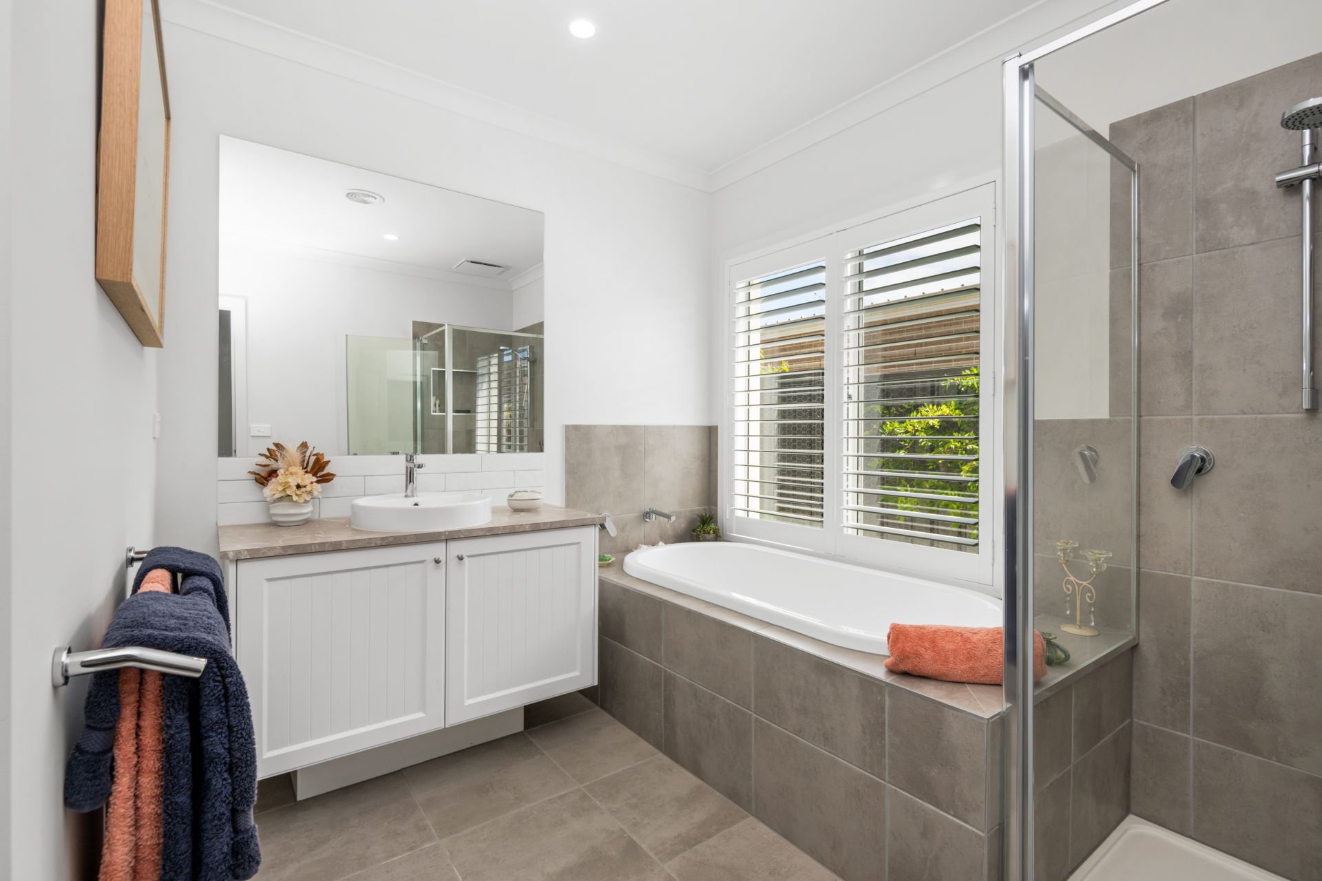 The clever floorplan includes four well-sized bedrooms. The master suite is a true sanctuary, complete with a walk-in robe and luxury ensuite. The three additional bedrooms, all with built-in robes and ceiling fans, are located in a separate wing and share a stylish family bathroom with a deep inset bath and corner shower.