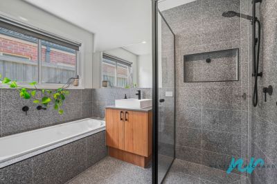 Each of the four sunlit bedrooms offers generous built-in wardrobes, while the luxurious master suite boasts a walk-in robe and a private ensuite featuring dual vanities and a spacious double shower. The main bathroom mirrors this sleek contemporary design, with a full-sized tub, large shower, and floor-to-ceiling tiling.