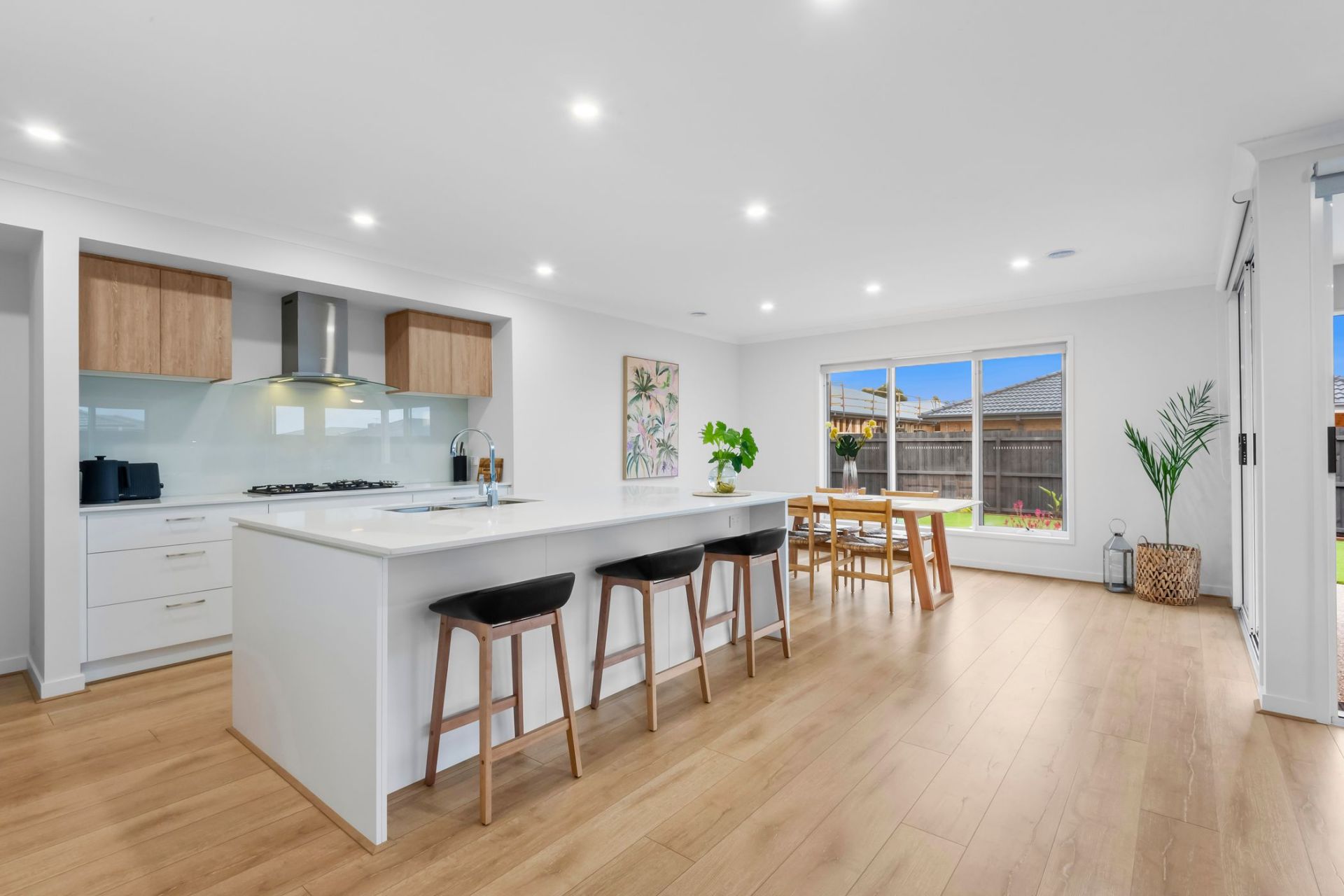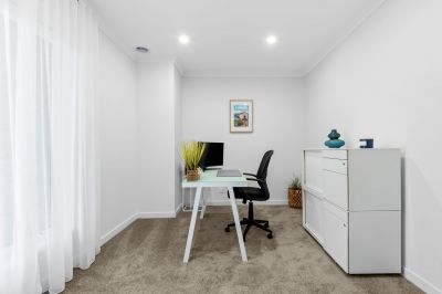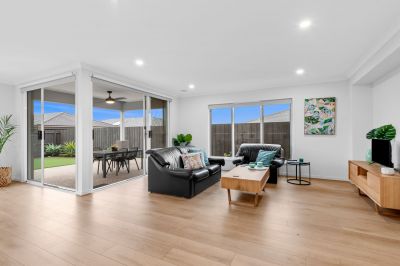 Upon entry, abundant natural light, soaring ceilings, and a seamless floorplan create a welcoming atmosphere, ideal for both relaxation and entertaining. The expansive open-plan kitchen, family, and dining area serves as the heart of the home, effortlessly extending through sliding doors to the alfresco, perfect for summer gatherings and BBQs. The modern kitchen is adorned with stylish stone benchtops, ample cupboard space, and a convenient walk-in pantry.