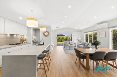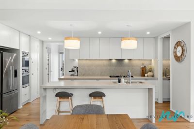 Step inside and be immediately impressed by the spacious open-plan living, dining, and kitchen zone, where crisp neutral tones, soaring high ceilings, and quality finishes create an atmosphere of refined elegance. The designer kitchen is a true showpiece, featuring double Ilve stainless-steel wall ovens, a 900mm five-burner gas cooktop, stone waterfall benchtops, Bosch dishwasher, and a generous butler's pantry-perfect for the passionate home chef or entertainer.